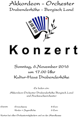 Die musikalische Vielfalt des Akkordeon-Orchesters Drabenderhöhe-Bergisch Land ist ein fester Bestandteil im Oberbergischen und immer am ersten Novemberwochenende zu hören, so auch im nächsten Jahr 2017.
